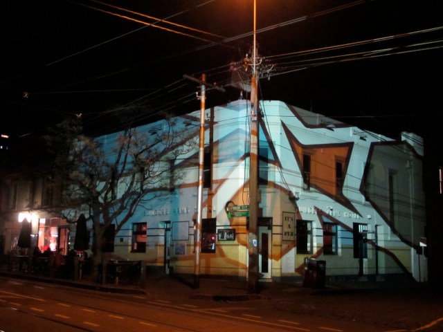 If you like you like to discover art while strolling it’s well worth a wander down Gertrude Street, Fitzroy, Melbourne – just go after dark. Here’s a few of the lovely and intriguing video projections gracing pavements, buildings, shop windows and more for the next few weeks as part of the Project 35 exhibition. My kids loved discovering the works as we walked along.