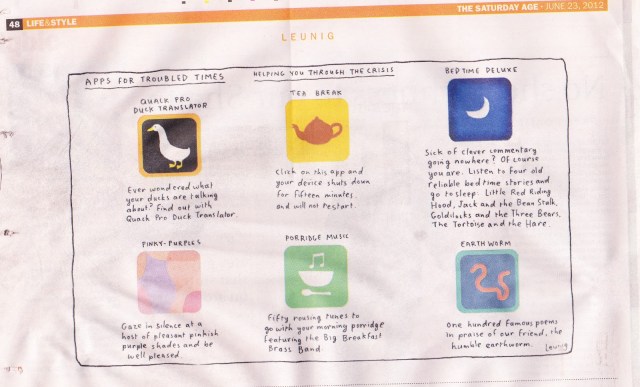 Apps For Troubled Times – Michael Leunig June 24, 2012November 30, 2013 | Loraine Love this wry and sweet pondering on apps from Michael Leunig.Make big to enjoy. Share this:Tweet Click to email a link to a friend (Opens in new window) Email Like Loading... Related