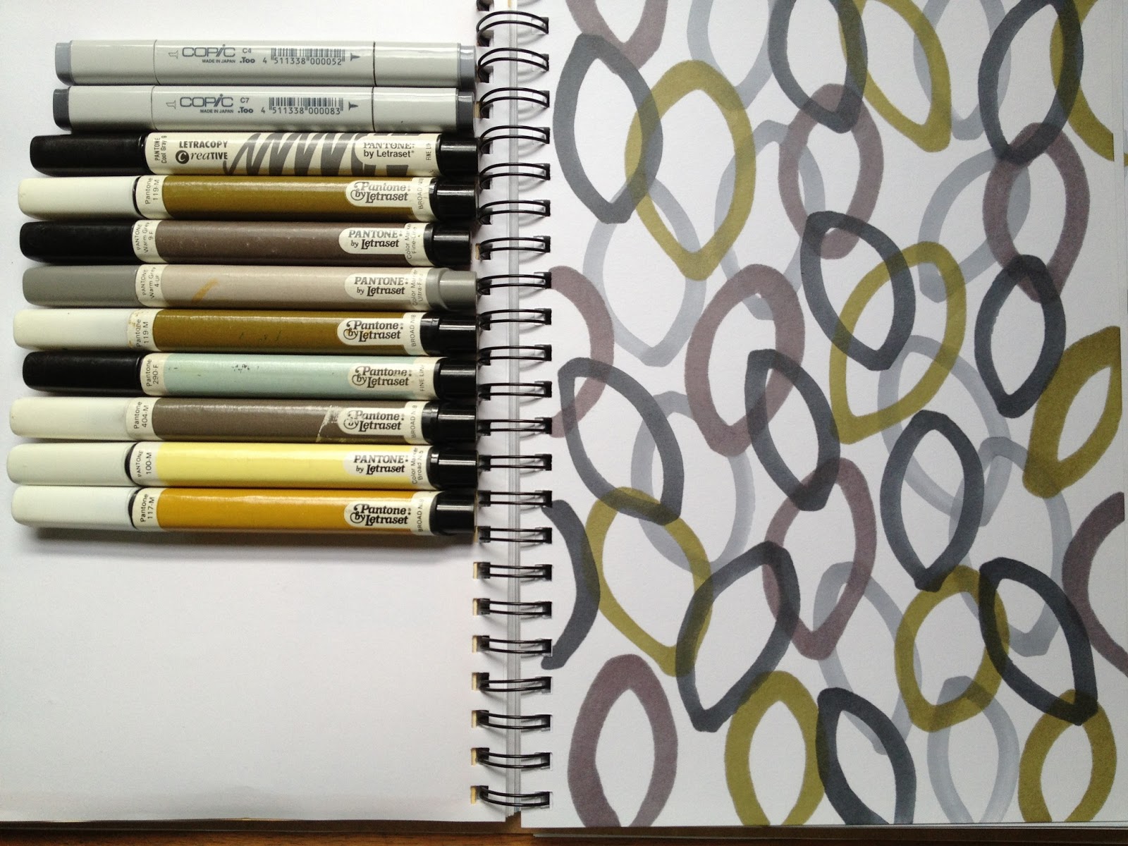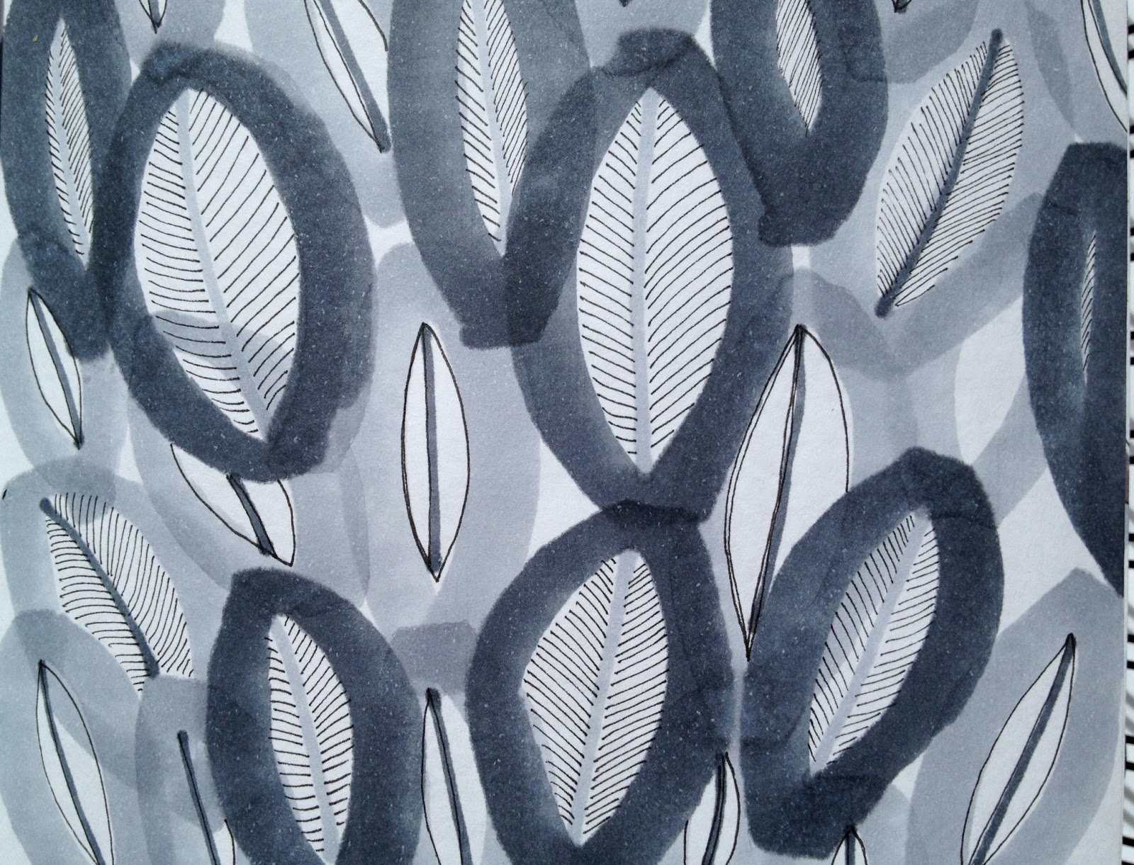 Inspired by the shape of the bones and the broad nibs of these vintage Pantone marker pens (I’ve had these around thirty years!) I had a lovely time covering lots of surfaces with this simple shape. The transparency of the markers makes for interesting layers and depth – I added a little Copic marker – I’m a bit fixated on grey at the moment. And yes, I do get a little obsessed with a theme or process until I feel like I can pretty much explore it no more :).